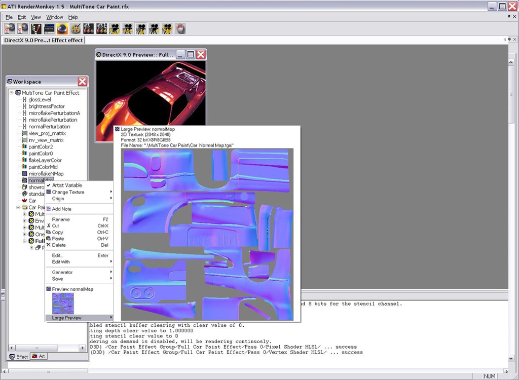 对于使用外部编辑器进行模型和纹理编辑的用户,RenderMonkey 支持在这些文件更改时自动重新加载它们。用户可以选择打开自动更新纹理和模型,然后 RenderMonkey 将在相关文件在磁盘上更改时自动重新加载纹理并重建几何对象的数据。或者,用户可以在预览窗口中通过按“t”或“m”手动执行此操作。这将导致 RenderMonkey 从文件中重新加载所有资源,并为效果重建所有运行时资源。