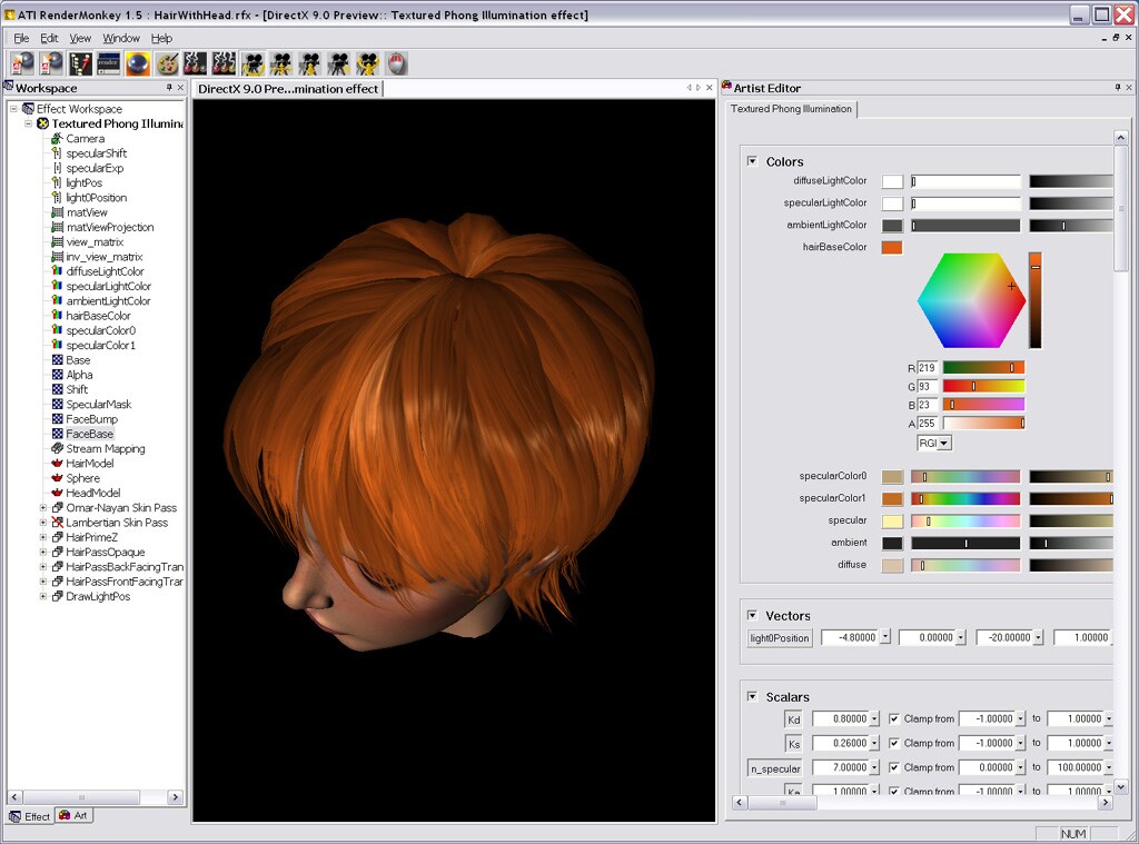 RenderMonkey 中的所有着色器参数都可以使用与参数类型相关的直观 GUI 小部件进行编辑。用户可以使用颜色轮小部件编辑颜色,使用便捷的数字滑块编辑标量和向量变量,在预览与这些纹理阶段关联的纹理表面时修改纹理/采样器状态,等等。