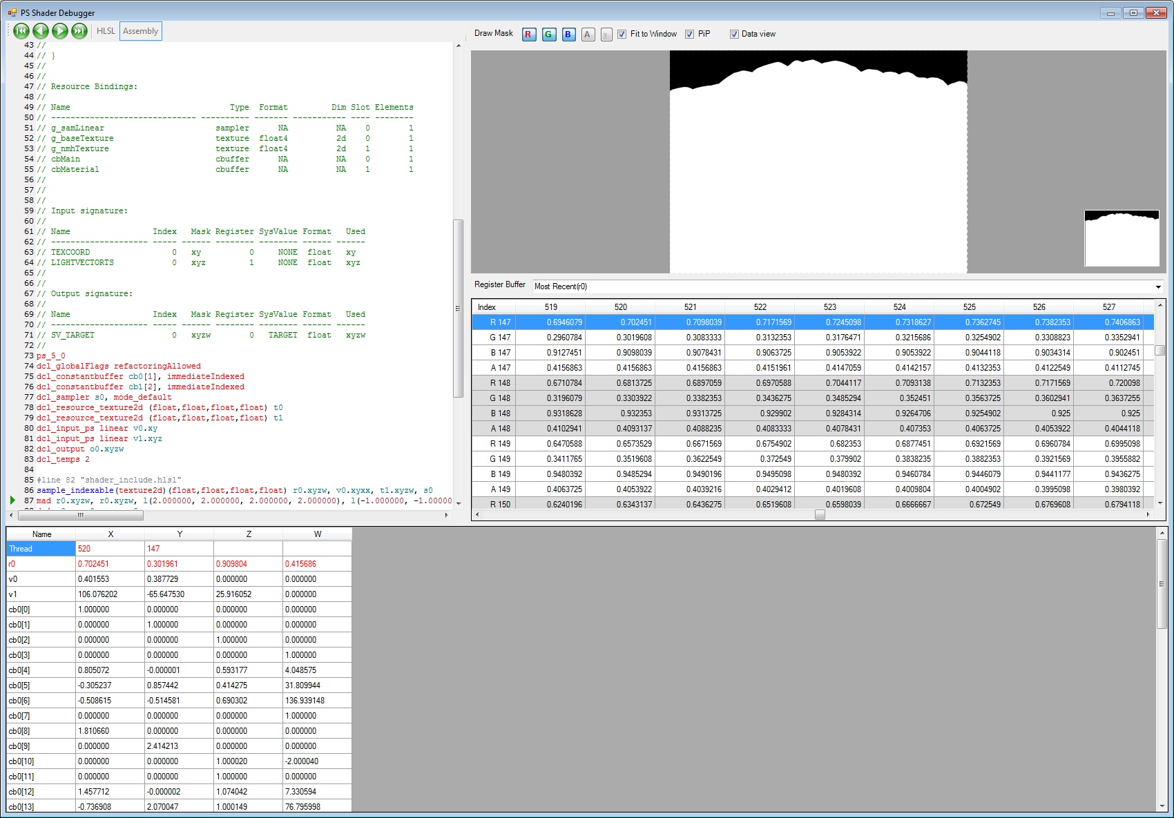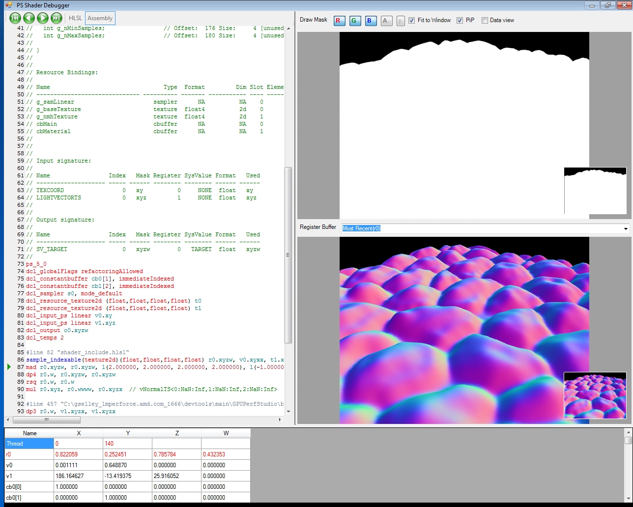着色器调试器允许您在应用程序内部调试 HLSL 和 ASM 的像素、计算和顶点着色器。它可以让您逐行步进您的着色器,并查看每个像素的寄存器、变量和常量值。甚至可以插入断点,以便您可以快速跳转到特定行并开始调试。为了帮助理解着色器的流程控制,绘制掩码图像会可视化前一个指令写入了哪些像素。