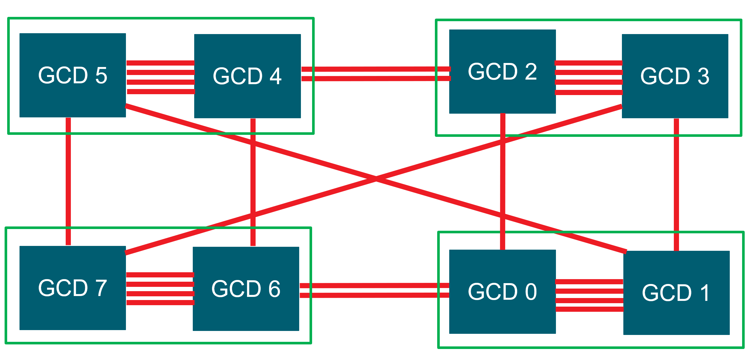 图 1. 包含 4 个 MI250 GPU(8 个 GCD)的节点图。每个绿色框代表一个具有两个 GCD 的 MI250 GPU。GCD 通过 infinity fabric 链接连接。
