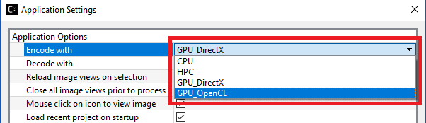 使用命令行工具时,可以通过“ -EncodeWith < DXC | OCL> ”来选择新的编码选项;使用 GUI 应用程序的对话框时,可以选择“Encode with”下拉菜单中的“GPU_DirectX”或“GPU_OpenCL”选项,如下图所示。