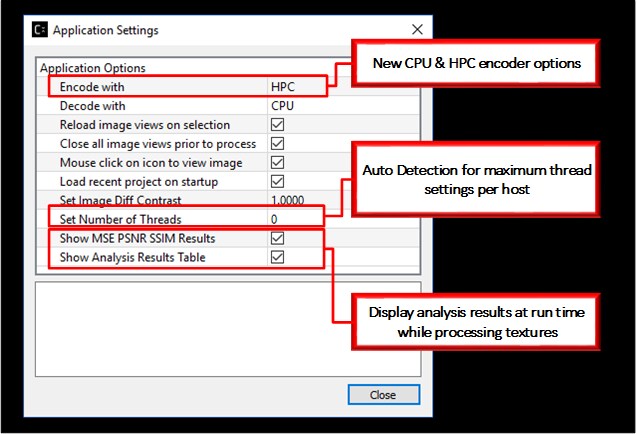 用户可以通过在“应用程序设置”下的“使用 Encode with”来选择处理 CPU (Compressonator SDK) 或 HPC (CMP_Core CPU ISA 优化) 编解码器。