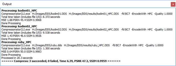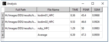 现在提供了一个新的表格视图,供用户查看性能、PSNR 和 SSIM 分析的测试分析结果。此视图可在图像纹理处理期间和之后使用。在 v3.1 中,用户必须对每个处理过的纹理运行图像差异视图来查看 PSNR 和 SSIM 结果,这对于大量图像来说会非常耗时。现在提供了一个综合结果视图供用户收集和查看已处理图像的结果。