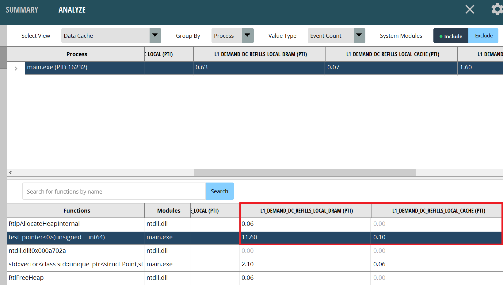 使用性能分析器分析PMC,选项集选择“Assess Performance (Extended)”。运行后,切换到“ANALYZE”页面,然后切换到“Data Cache”视图,查看与分支相关的PMC。L1缓存未命中的数量是每千条指令的L1_DEMAND_DC_REFILLS_LOCAL_DRAM、L1_DEMAND_DC_REFILLS_LOCAL_CACHE和L1_DEMAND_DC_REFILLS_LOCAL_L2。PTI后缀表示数据已按每千条指令进行了归一化。当然,这些名称在不同版本的性能分析器中可能会有所不同。它取决于PPR中相应的硬件PMC。首先,我们分析test_pointer<0>函数。显然,每千条指令有11.60次由L1缓存未命中引起的内存读取,以及0.1次由L1缓存未命中引起的较低级缓存读取,以及0.1次由L1缓存未命中引起的L3缓存读取。内存读取次数应尽可能少。