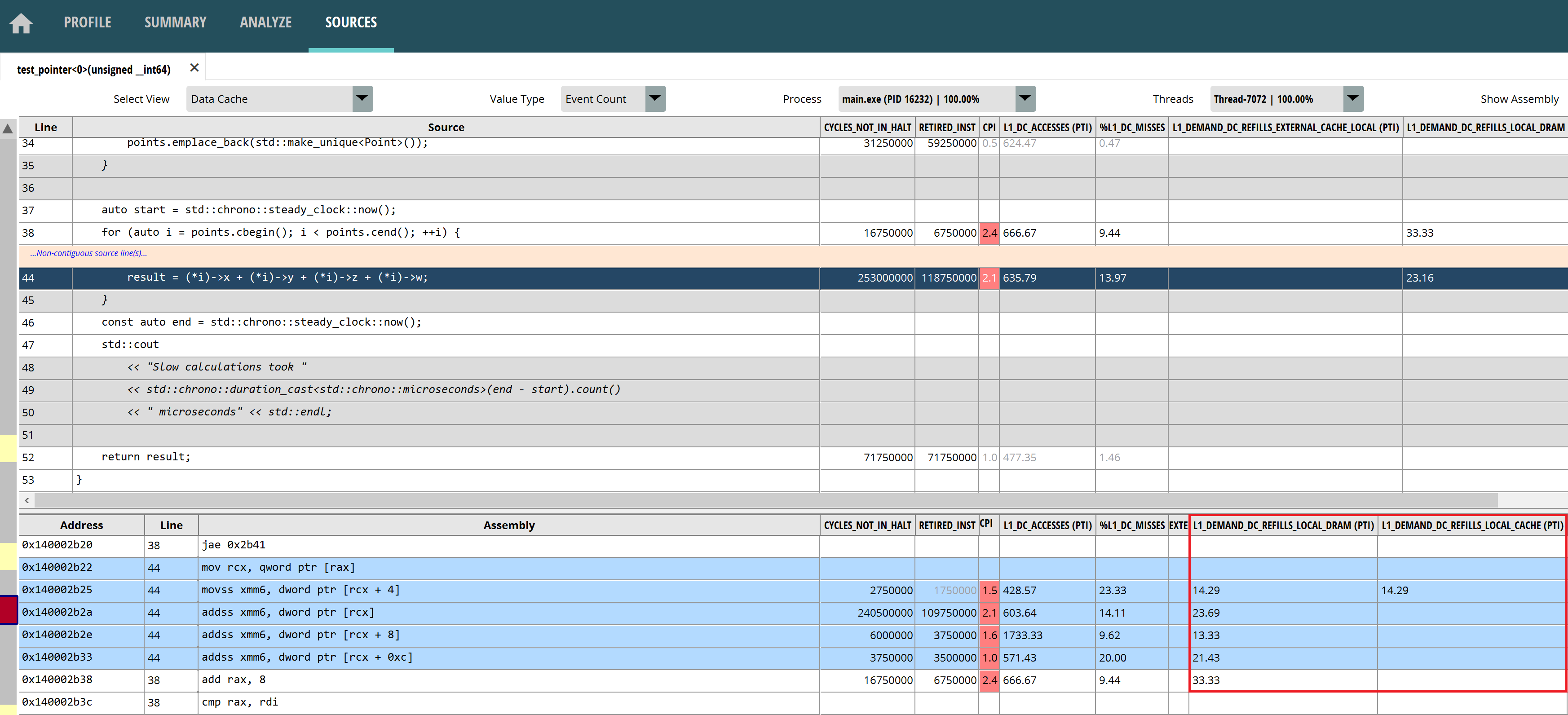 双击test_pointer<0>函数会打开“SOURCES”页面。可以看到,缓存预取失败主要发生在指针操作附近。