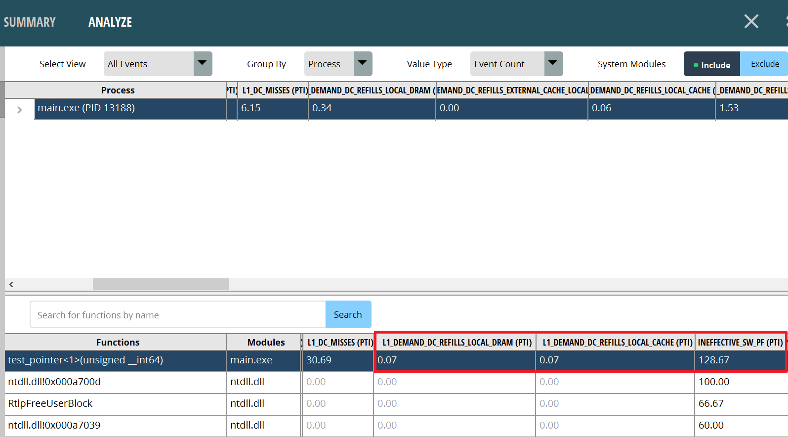 INEFFECTIVE_SW_PF。可以看出,在示例中,每千条指令有128.67次无效的软件缓存预取,这在实际项目中需要避免。