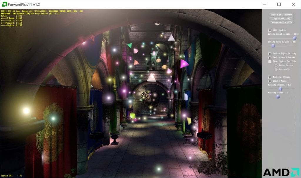 此示例提供了 Forward+ 算法的实现示例,该算法扩展了传统的 Forward 渲染,以支持大量动态光照,同时保持性能。