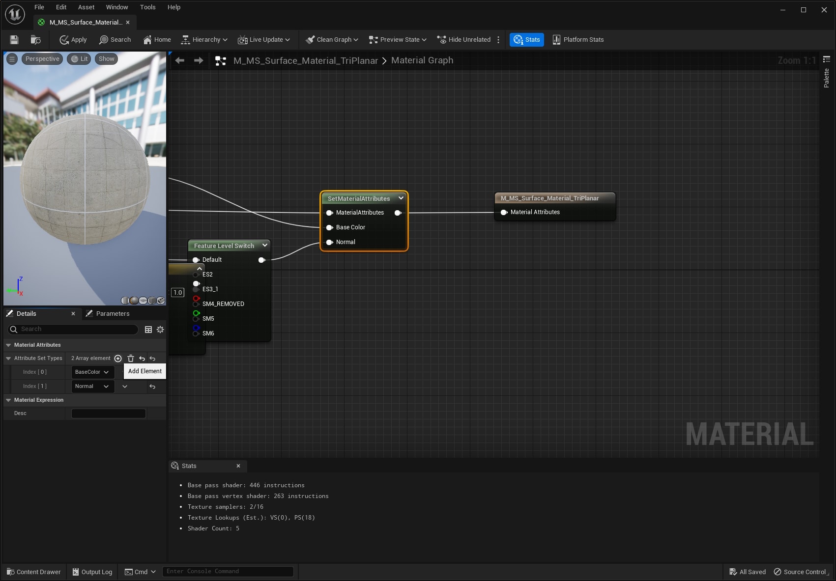 在此版本的 Unreal Engine 中,用户界面已更改。选择 SetMaterialAttributes 并添加一个新元素。