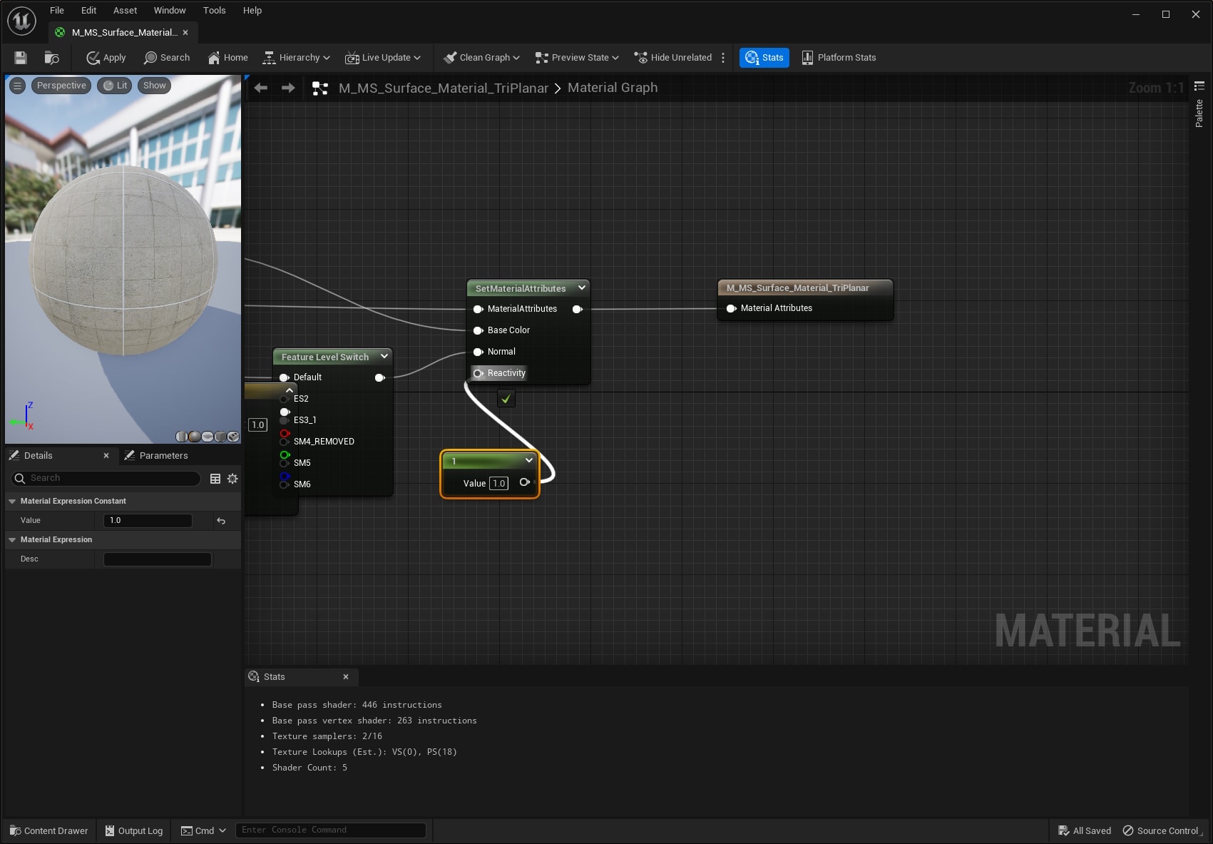 在下面使用 UE 4.27 的截图比较中,左侧“强制反应性着色模型值”设置为 0,右侧设置为 1。