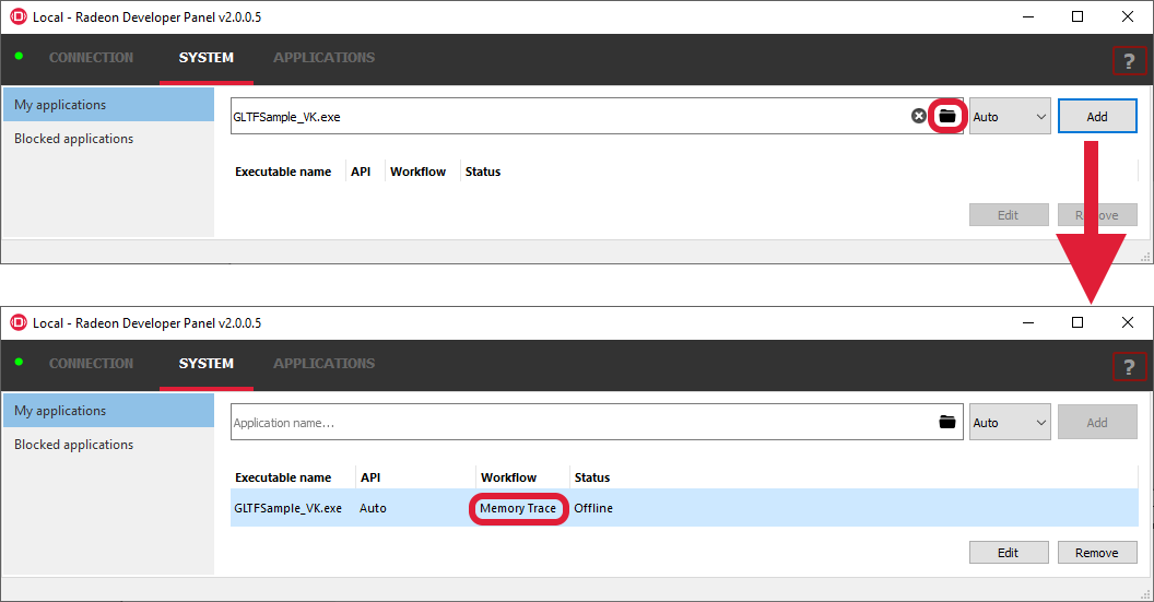 运行 Developer Panel,并在出现提示时允许它通过 Windows® 防火墙。数据通过网络回送接口传输,这就是为什么您可能会看到防火墙提示。使用新的 Panel,您需要通过 System 选项卡添加要跟踪的可执行文件。查找您的应用程序名称,然后单击“Add”(添加),使其列在下面的“My Applications”(我的应用程序)列表中。它应该将“API”设置为“Auto”(自动),将“Workflow”(工作流程)设置为“Memory Trace”(内存跟踪)。