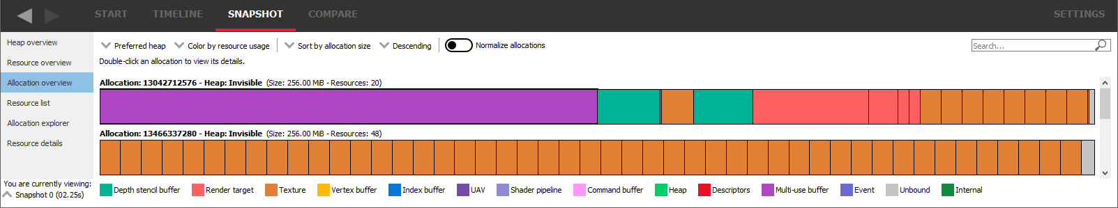 但是,DirectX®12 仍然可能出现问题。创建许多已提交资源,这些资源在创建时被标记为驻留,仅在销毁时才被逐出,这可能会占用内存预算。查看“Allocation Overview”(分配概览)并看到成千上万的单个分配-资源关系,可能表明使用子分配和放置资源可能是有益的。我们的D3D12 内存分配器可以在这些情况下提供帮助。