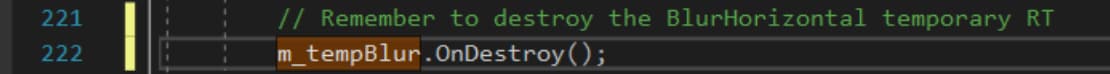 查看我们示例中的代码,我们会发现 BlurHorizontal 渲染目标是如何创建的。它是我们模糊效果的临时渲染目标。从我们的快照比较中得知此资源未按要求销毁,从我们的析构函数代码中可以看到,该资源的 OnDestroy() 调用丢失了。我们将其添加回来,在第二次内存跟踪中,我们将看到泄漏的渲染目标资源不再被列出。