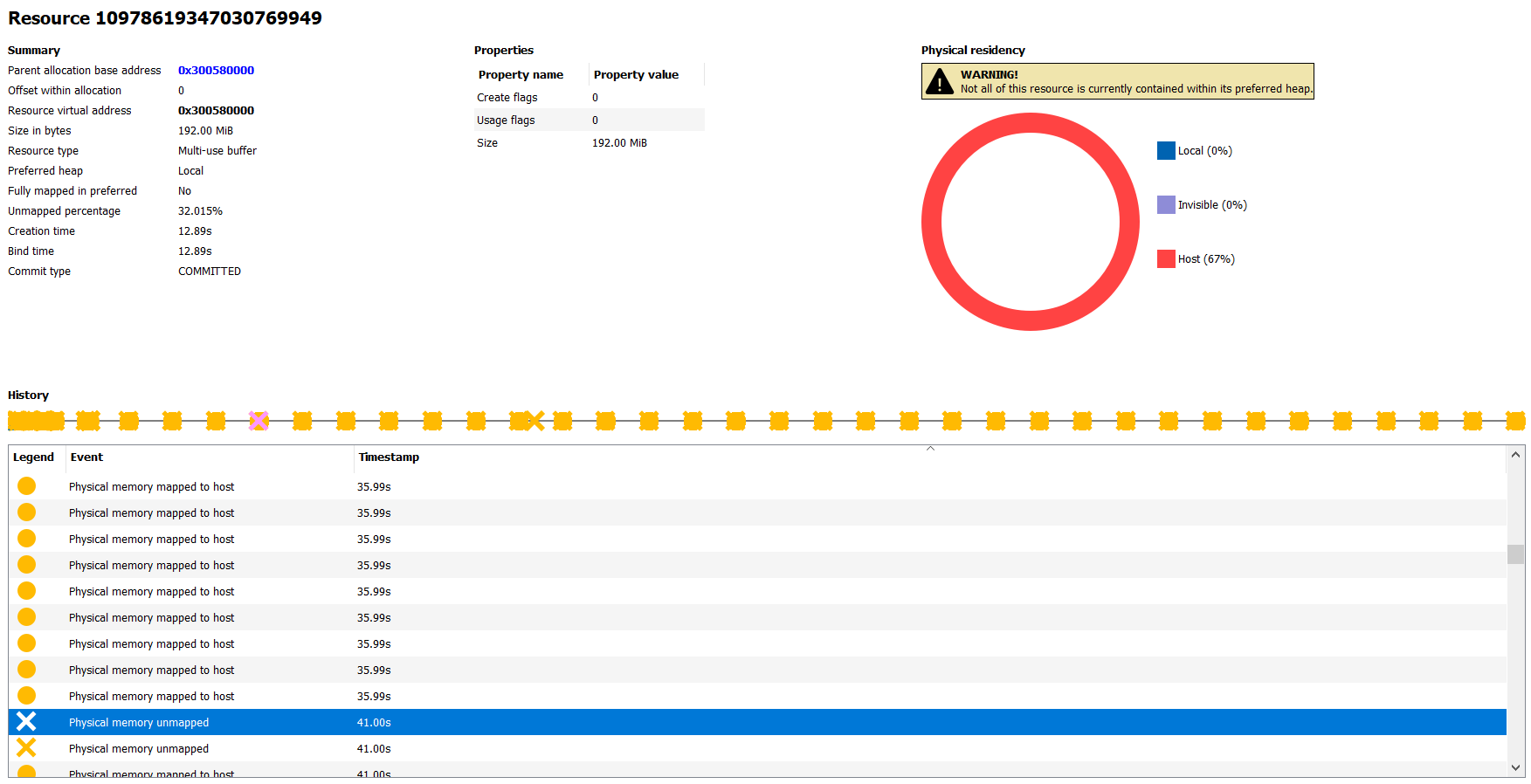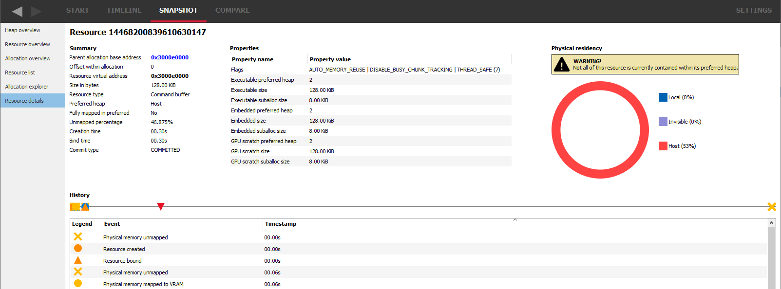 要理解内存的一个重要方面是,资源的部分内容可以位于我们想要的位置,而其他部分则被分页出,或者根本没有映射。当我们设置这些资源选项时,我们会看到列出了三个命令缓冲区,但其中两个是红色的,表示它们没有完全位于首选堆位置。双击第一个会带我们到“Resource details”(资源详细信息)窗格,并立即显示一个警告,告知我们并非所有资源都位于创建时请求的首选堆中。只有 53% 的此资源映射到了首选 HOST 堆,其余部分未映射。