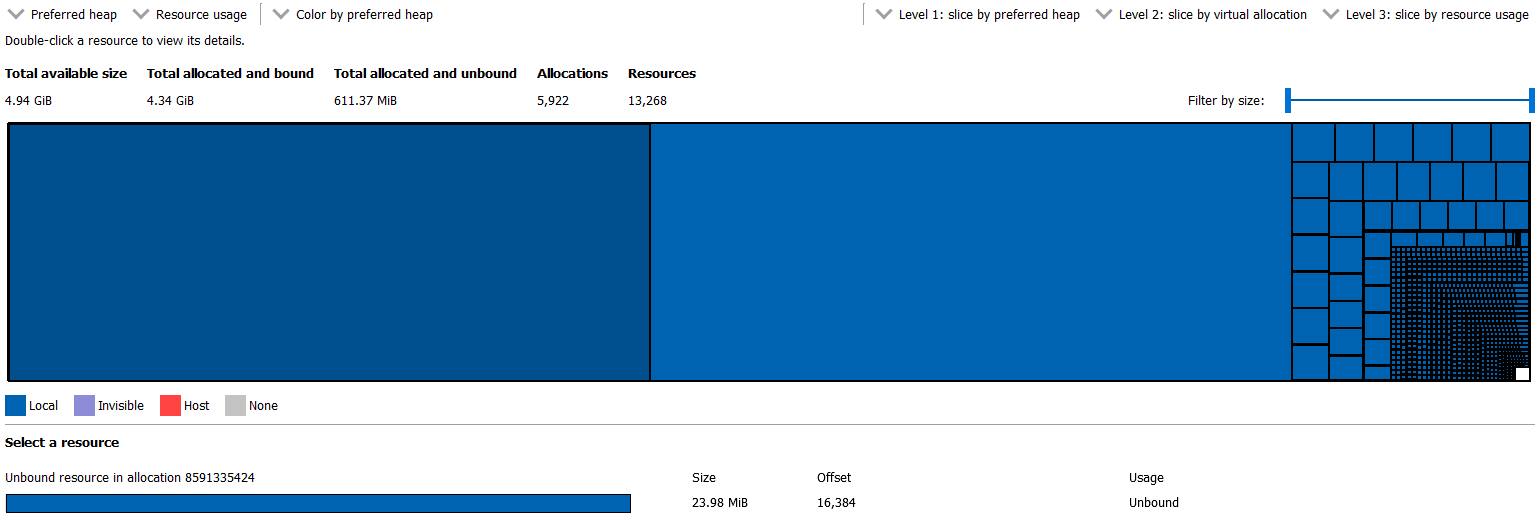 您首先会看到“Heap Overview”(堆概览)。它提供了此时间点内存构成基本信息。它显示了 Local(本地)、Invisible(不可见)和 Host(主机)内存堆,以及有关这些堆的一些规格,例如 CPU 和 GPU 缓存是如何在它们之间处理的。还列出了最小和最大分配数据,以及堆内分配的资源类型的饼图。从这里您可以立即看到大部分资源类型的位置。