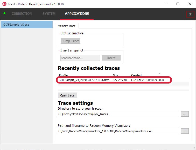 随着 RMV 的推出,我们还引入了新的 Radeon™ Developer Panel (RDP),它对您之前可能使用过的 RDP 进行 Radeon™ GPU Profiler 跟踪的工作流程进行了微小改动。它非常相似,但有一个重要的变化,我们将在下面进行概述。如果您已经熟悉设置 RDP 2.0,您可以跳到“运行您的应用程序”。