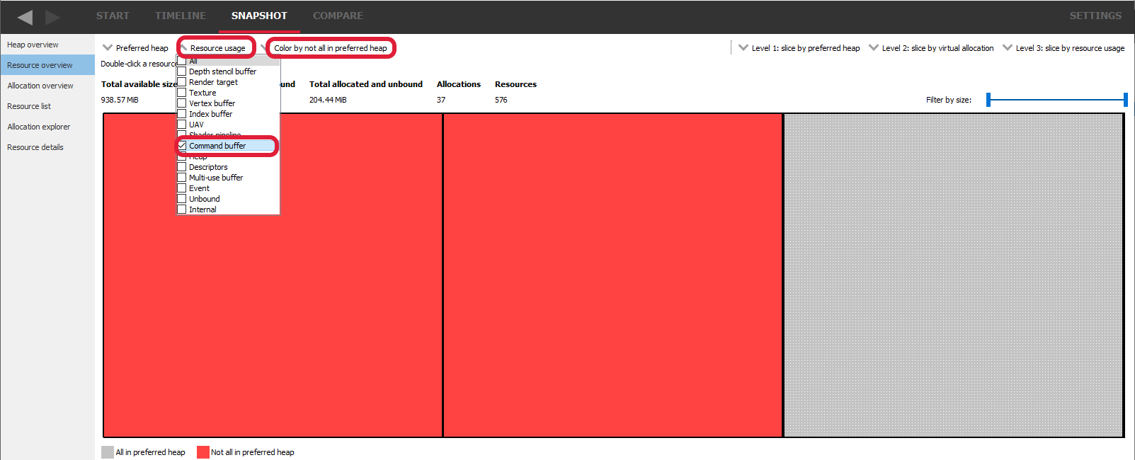 例如,我们可能想看看是否有任何正在使用的资源没有完全映射到 VRAM。为此,命令缓冲区是一个简单的例子。我们从“Resource usage”(资源使用)下拉菜单中仅选择“Command buffer”(命令缓冲区),并“Color by not all in preferred heap”(按非全部在首选堆着色)。