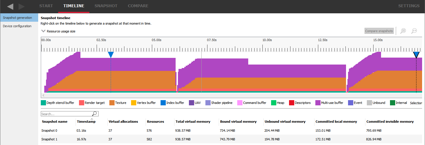 在此跟踪中,我们看到时间线看起来是静态的,除了前几秒钟快速的加载峰值。鉴于我们的跟踪是用 Cauldron GLTV 示例拍摄的,刚刚加载到一个场景中,没有其他更改,这正是我们所期望的。此测试中内存需求的任何增加都可能是潜在的错误。为了确认这一点,我们可以拍摄两个快照 – 一个在加载后不久,另一个在测试快结束时 – 并进行比较。