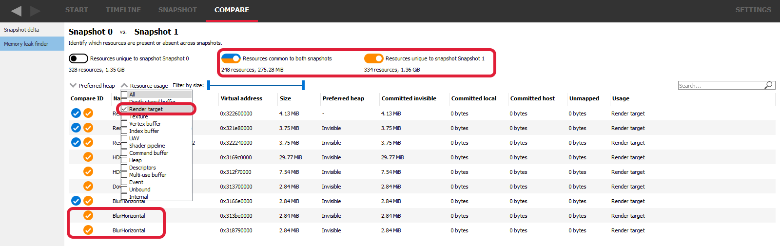 在“compare ID”下有两个复选标记的表示它们存在于两个捕获中,因此我们不关心它们。但是,当我们还包括“Resources unique to Snapshot 1”(快照 1 独有的资源)时,我们可以看到“BlurHorizontal”的两个额外条目,它们仅存在于第二个快照中。这些就是我们额外的渲染目标!
