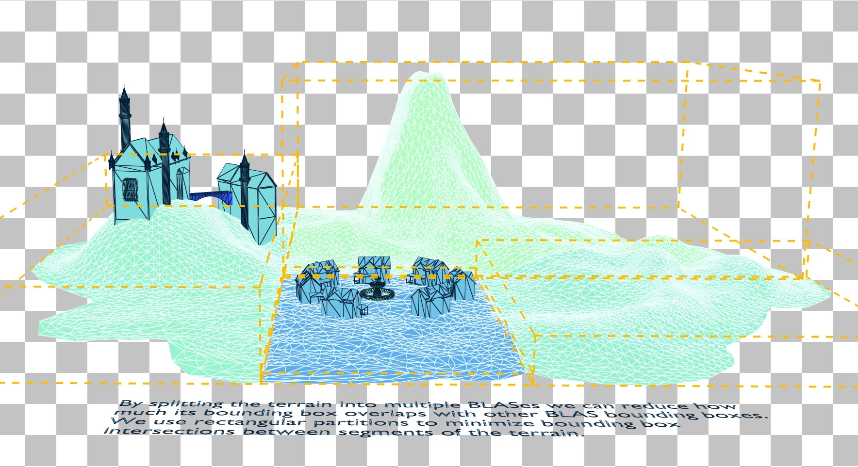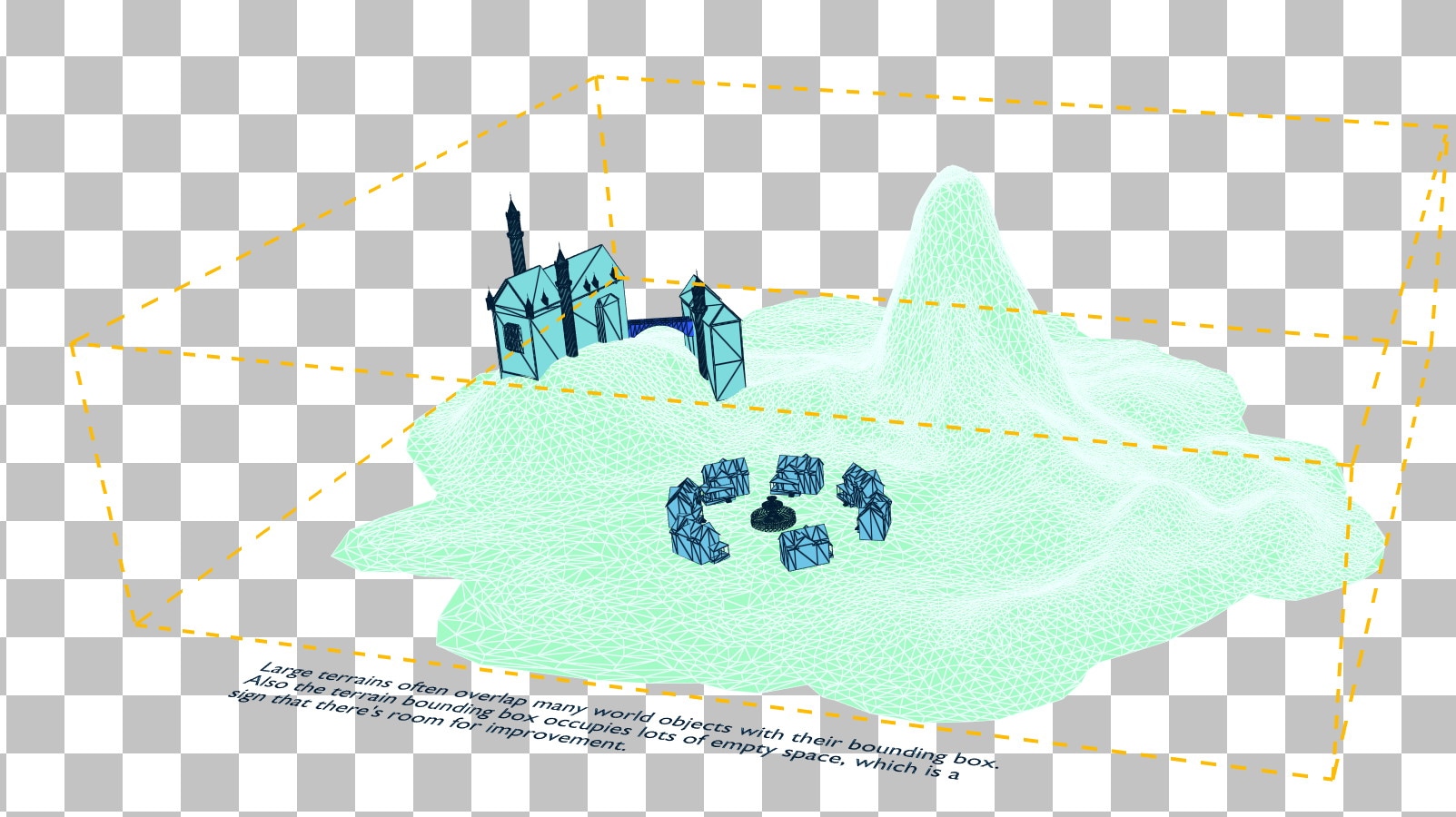 在上图中,我们可以看到房屋和城堡完全被地形的包围盒包围,而这个包围盒还占用了大量空白空间。