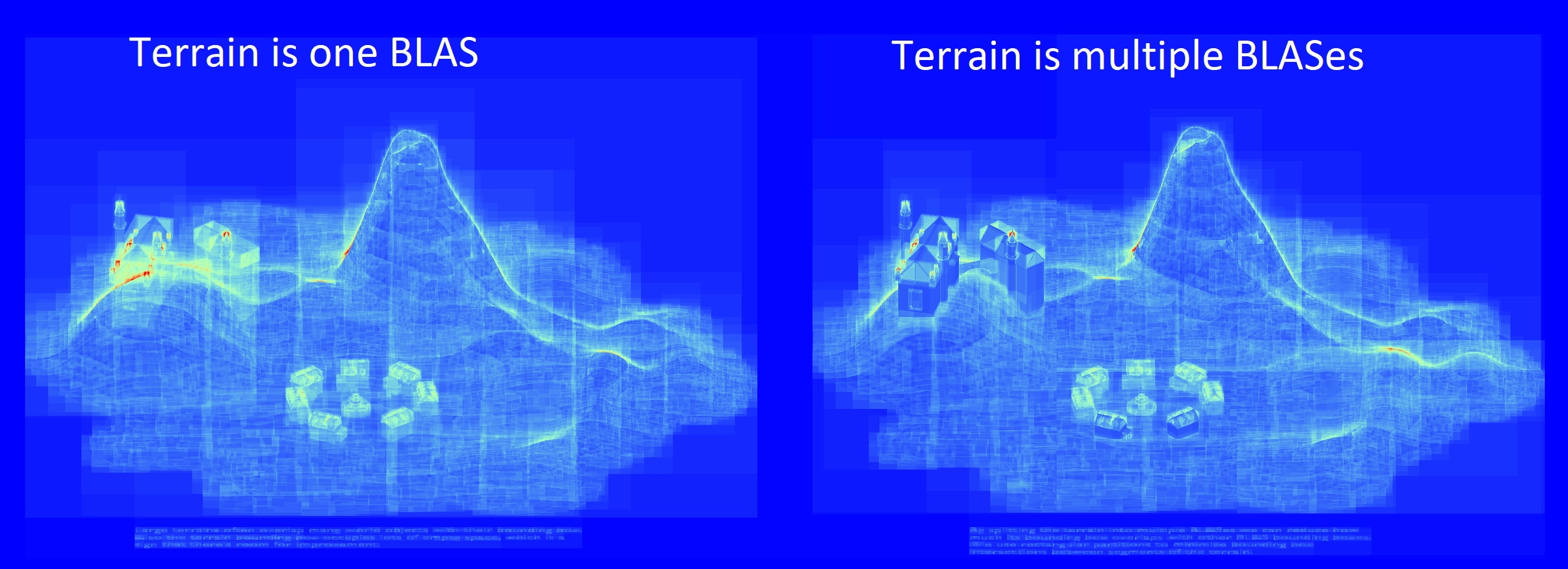 将地形分割成块可以大大减少与其他实例的包围盒的重叠,并且包围体积现在也能更紧密地围绕地形。这里的权衡是,更多的实例意味着更长的 TLAS 构建时间,但对于像地形这样影响游戏中大多数帧的遍历时间的内容来说,这通常是可以接受的权衡。仍然建议使用 Radeon GPU Profiler 来分析 TLAS 的构建时间,以确保其可接受。