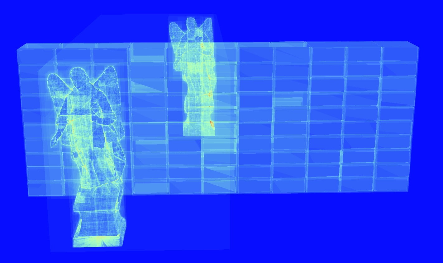 通过将 the angel statue 的 BLAS 更改为仅包含一个 the angel statue 并对其进行两次实例化,the angel statue 的包围体积不再与墙壁的发生交叉。这使得驱动程序有机会构建一个 TLAS,可以在无需遍历远处 the angel statue 的 BLAS 的情况下更早地终止遍历。请记住,即使在减少实例重叠后,X 射线效果仍然可能持续存在,具体取决于驱动程序如何构建加速结构,但通过最小化重叠,总体 TLAS 质量预计会更高。