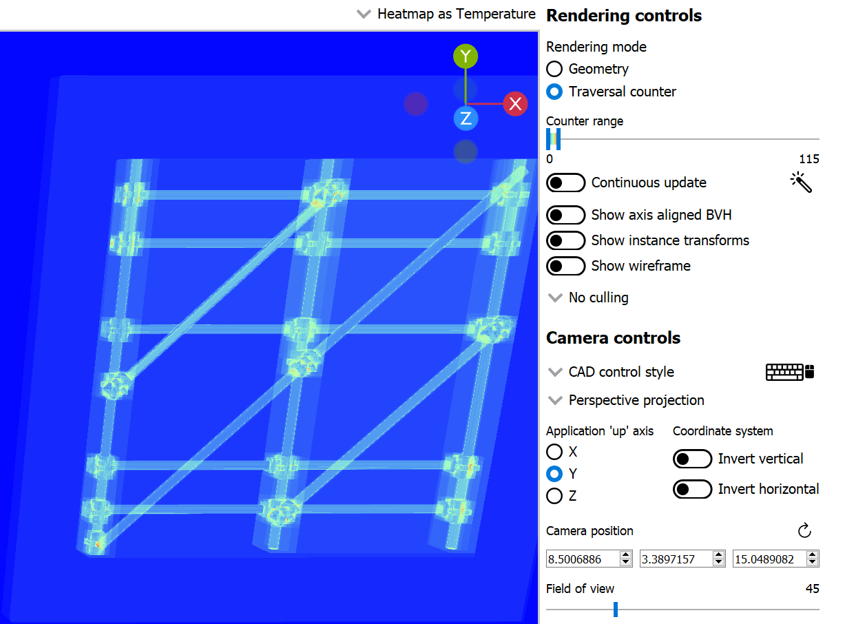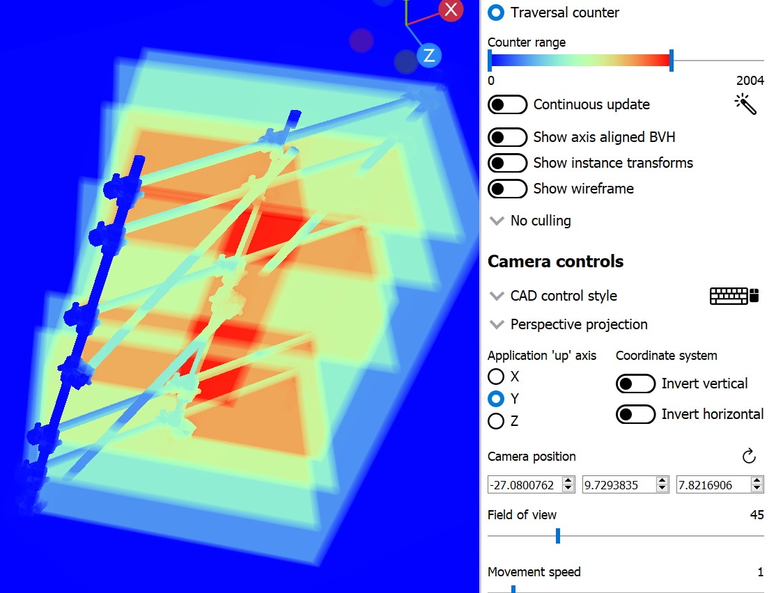 在几何体渲染模式下,剔除下拉菜单仅影响视口渲染器,并不反映捕获的应用程序。另一方面,在遍历渲染模式下,剔除模式扮演了着色器中传递给 trace ray 调用的正面/背面剔除标志的角色。这意味着可以通过实例标志为每个实例覆盖或修改剔除行为。通过选择正面剔除,实例之间的遍历成本差异变得明显。