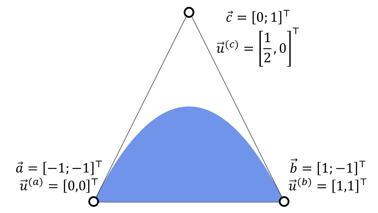 Loop 和 Blinn 的观察是,光栅化阶段会插值 [u;v]⊤。这实现了从二次贝塞尔曲线的控制点 a, c, and b 的二次贝塞尔曲线的坐标空间。
