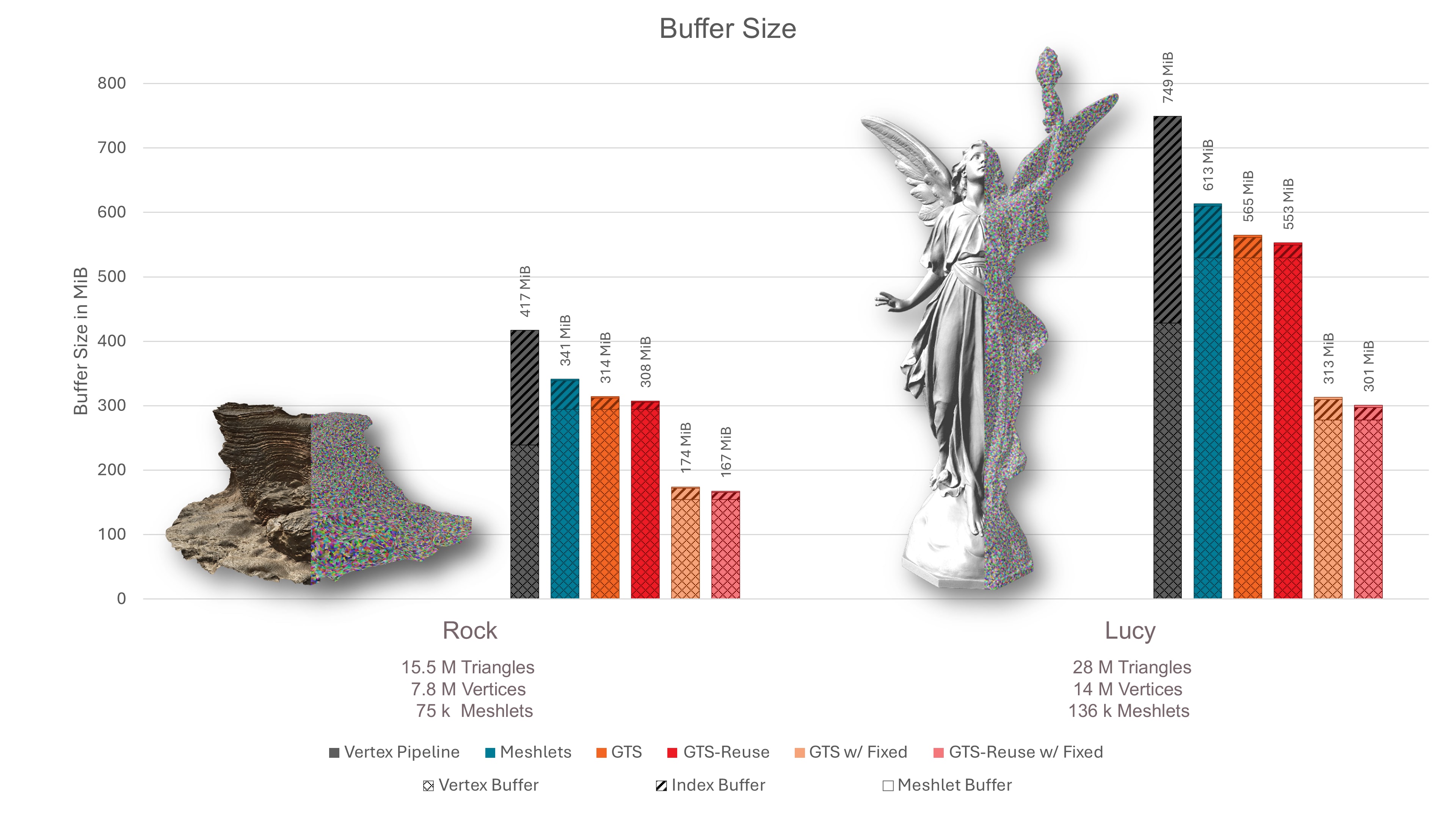 我们首先比较顶点管道的索引和顶点缓冲区的大小与不同网格着色管道组合的大小。网格着色管道的数据大小包括带有网格片边界处重复顶点的顶点缓冲区,以及局部索引缓冲区和用于存储网格片元数据的偏移量缓冲区。