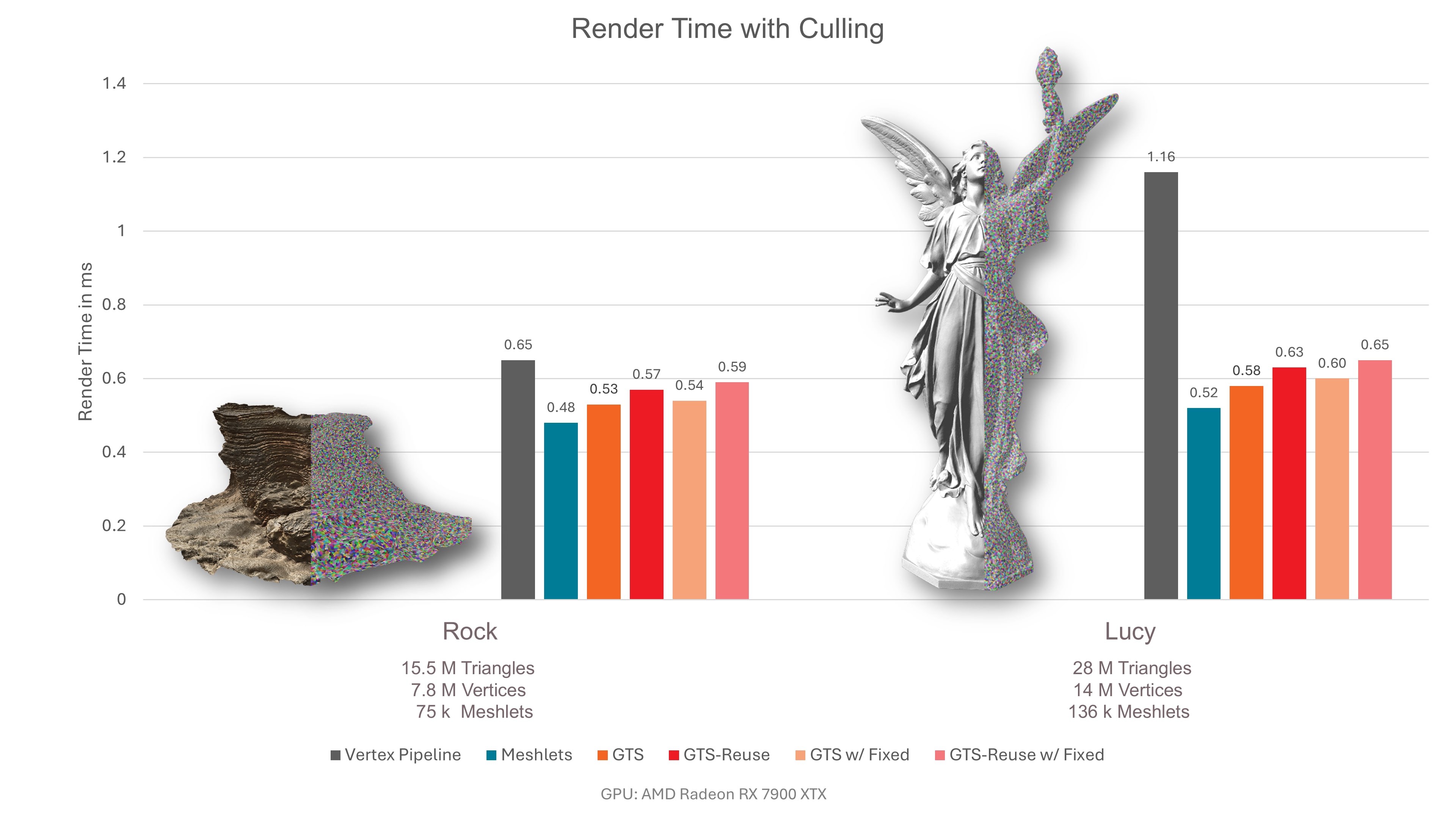 该项目可以追溯到 2010 年,当时 Quirin,本文作者之一,为他的 博士论文 并行地在 GPU 上解压通用三角形带 (GTS)(另见相关的 论文 和 演讲)。该算法与 Epic Games 在 2021 年随 Nanite 引入的 GTS 解压算法相似。然而,在 2010 年,如今的计算着色器尚不存在。计算管线是独立的 API,因此图形和计算之间的切换非常昂贵,并且会减慢整体渲染时间。