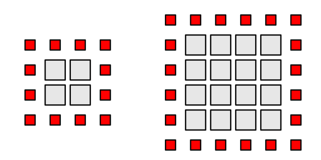 假设一个 1 像素的邻域和一个正方形 2D 线程组。该组应加载组区域内的所有像素和一个 1 像素的边框以满足边界条件要求。边长为 X 的正方形区域需要 X^2 个内部像素和 4X+4 个边界像素。内部负载随平方增加,而边界开销——读取但未写入的像素——随线性增加。