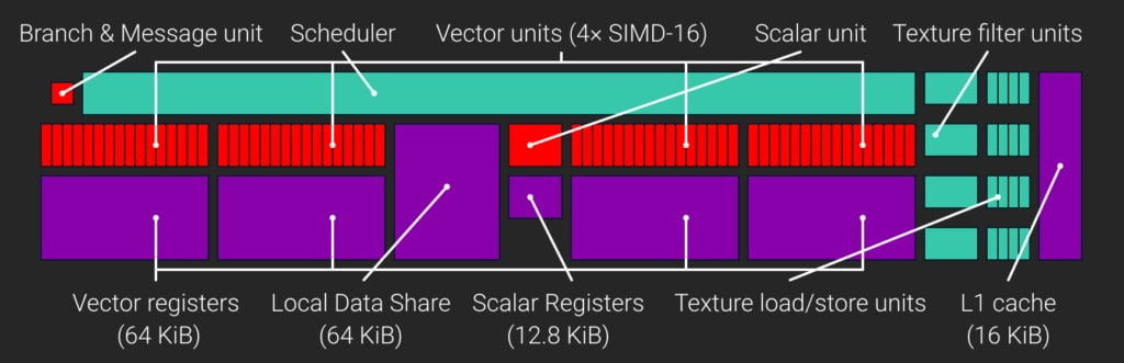 一个 GCN CU 包含四个 SIMD,每个 SIMD 拥有一个 64 KiB 的 32 位 VGPR(向量通用寄存器)寄存器文件,每个 CU 总共有 65,536 个 VGPR。每个 CU 还有一个 32 位 SGPR(标量通用寄存器)寄存器文件。直到 GCN3,每个 CU 包含 512 个 SGPR,而从 GCN3 开始,数量增加到 800 个。这意味着每个 CU 有 3200 个 SGPR,即 12.5 KiB。