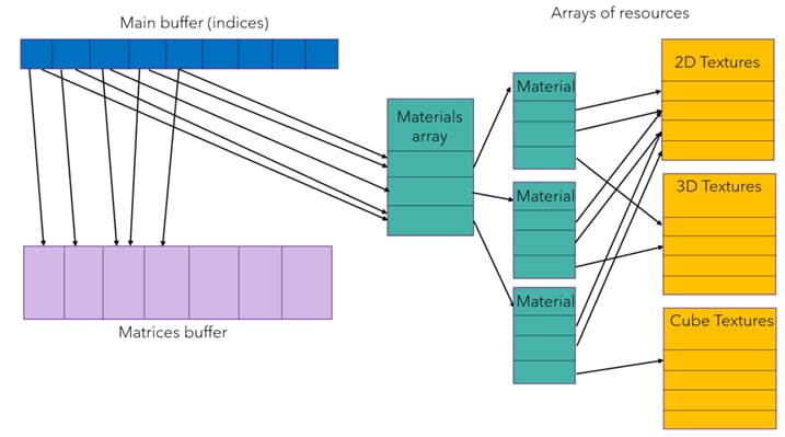 我们只有一个主缓冲区,它在绘制调用之间变化(实现为环形缓冲区),其中包含一个引用正确的材质缓冲区和正确矩阵的描述符索引。每个材质缓冲区包含使用纹理的索引。