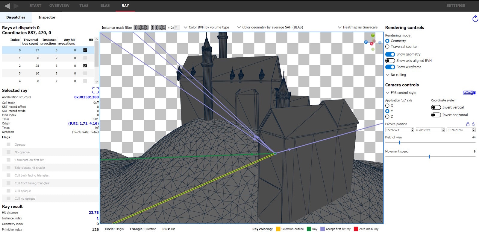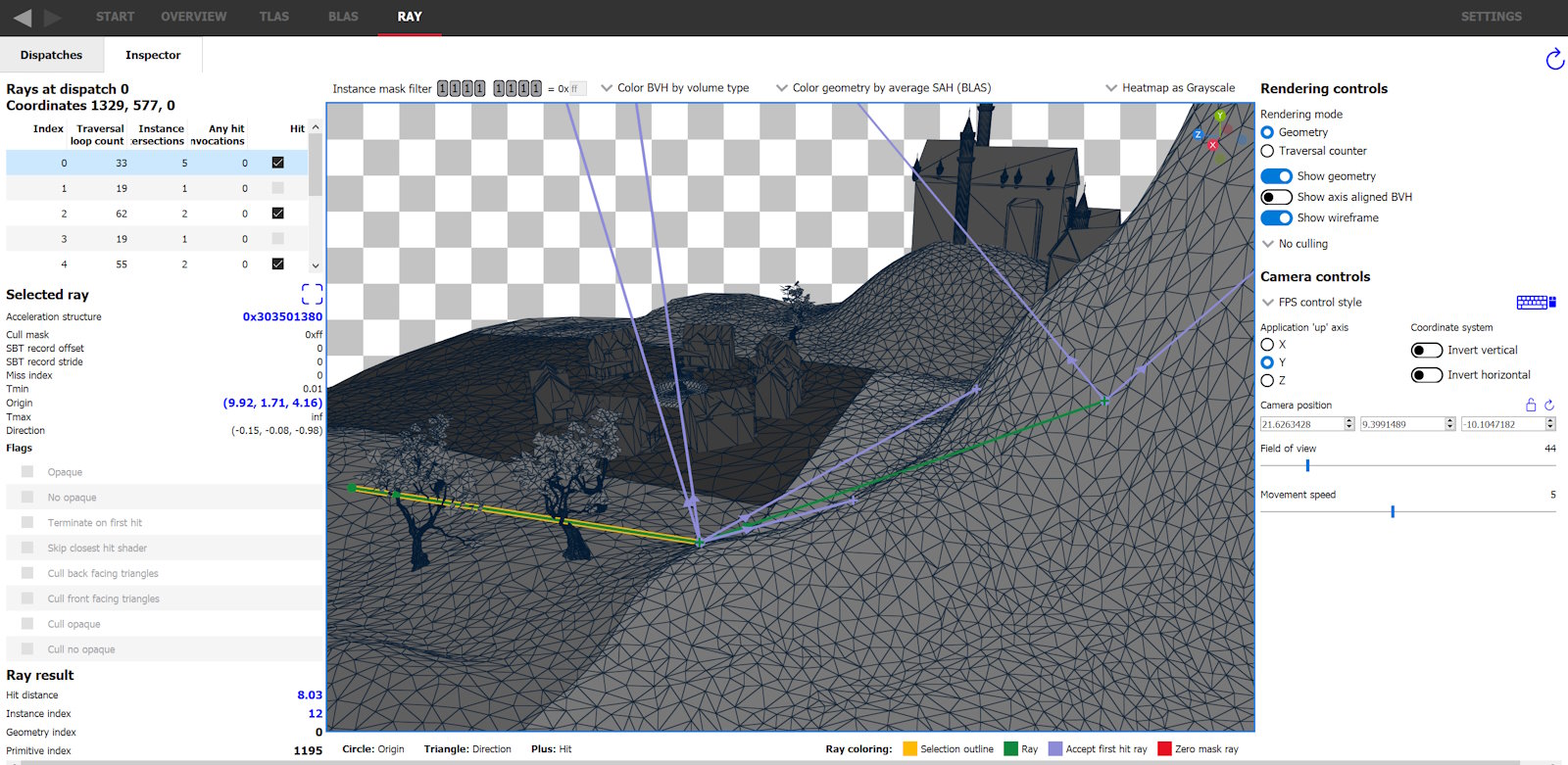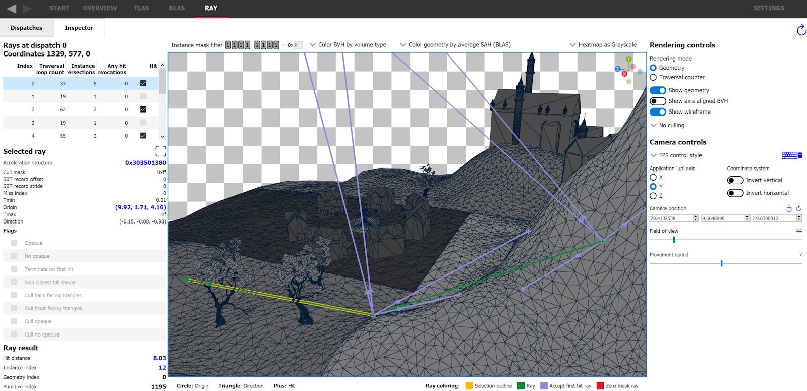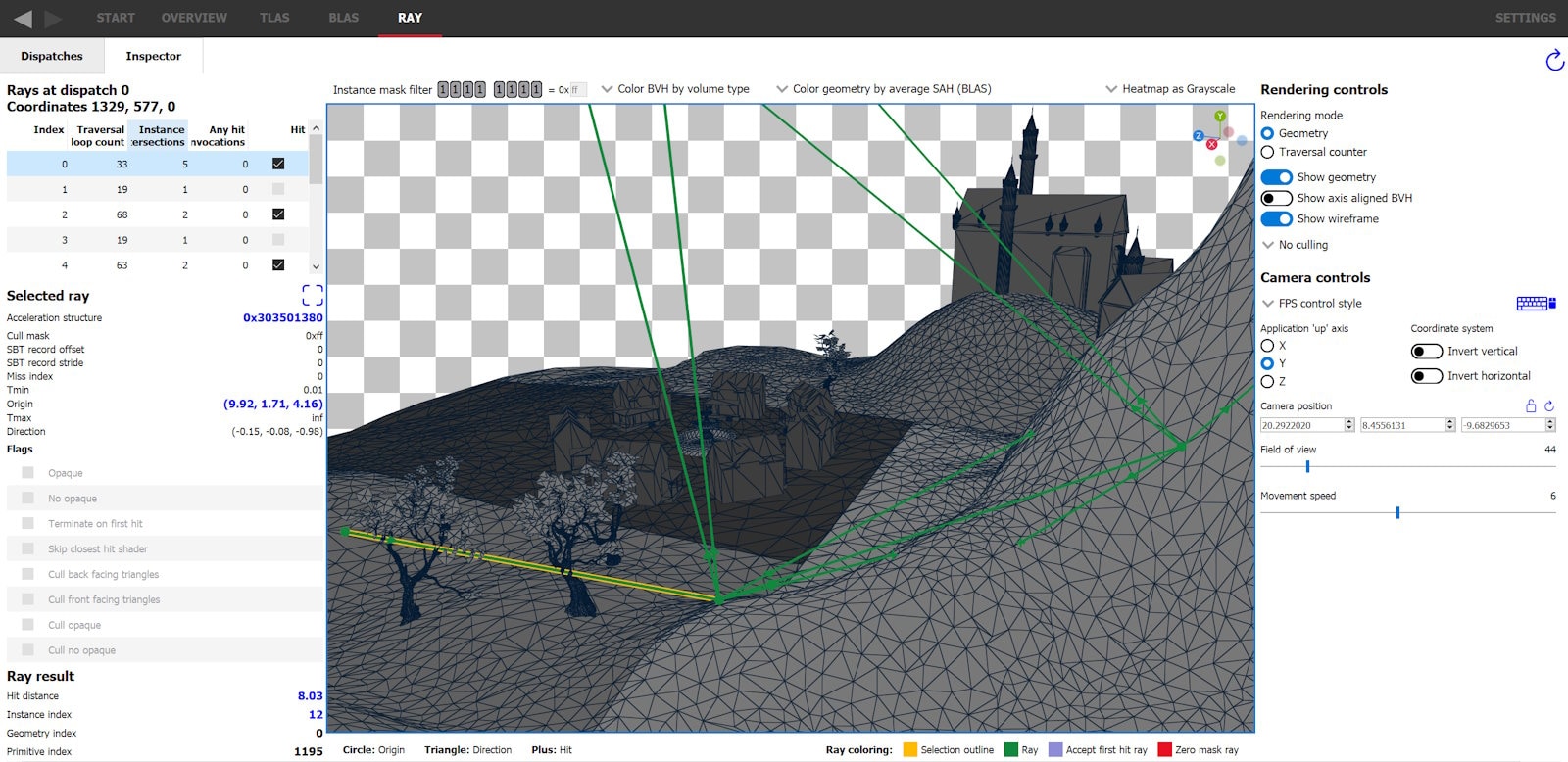 TLAS 和 BLAS 选项卡已允许切换到遍历渲染模式,以模拟加速结构的遍历成本,但这可能与捕获的应用程序实际产生的成本有显著差异。模拟视图从视口相机为每个像素投射一条光线,而应用程序可以为每个像素投射任意数量的光线,这些光线不需要源自相机,并且可以具有独特的光线标志、剔除掩码和 Tmin/Tmax。Ray (光线) 选项卡允许查看所有投射的光线及其参数。这些信息将以热图的形式显示在 Dispatches (分发) 选项卡中,并且可以通过 Inspector (检查器) 选项卡以 3D 方式查看每条光线。