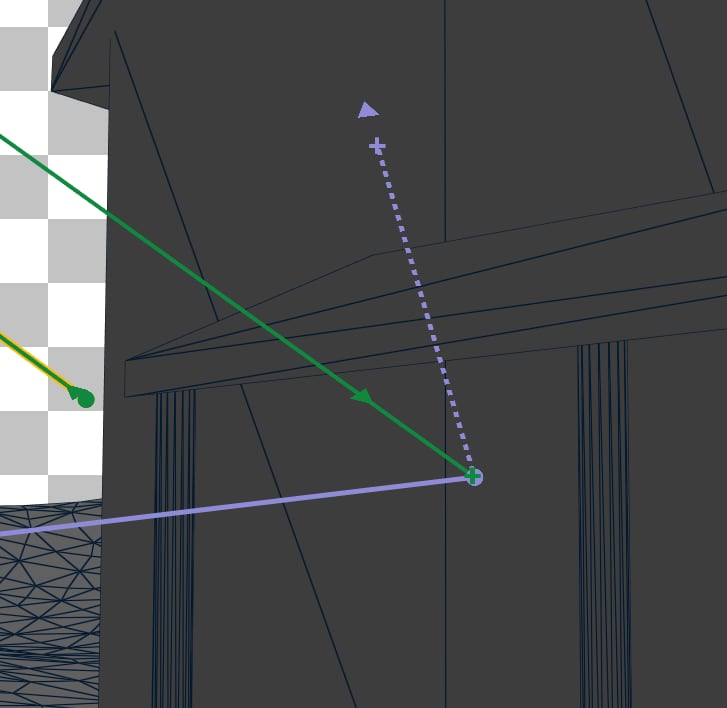 光线的虚线表示光线被三角形几何体遮挡。那么这条阴影光线直接投射到了房屋墙壁上,尽管很明显结果会是命中。可以通过在着色器中检查新光线方向与三角形法线之间的点积是否为负来完全避免这些阴影光线。在实现这些更改后,分发面板显示我们现在投射了 9,437,792 条光线,而不是之前的 10,875,244 条。