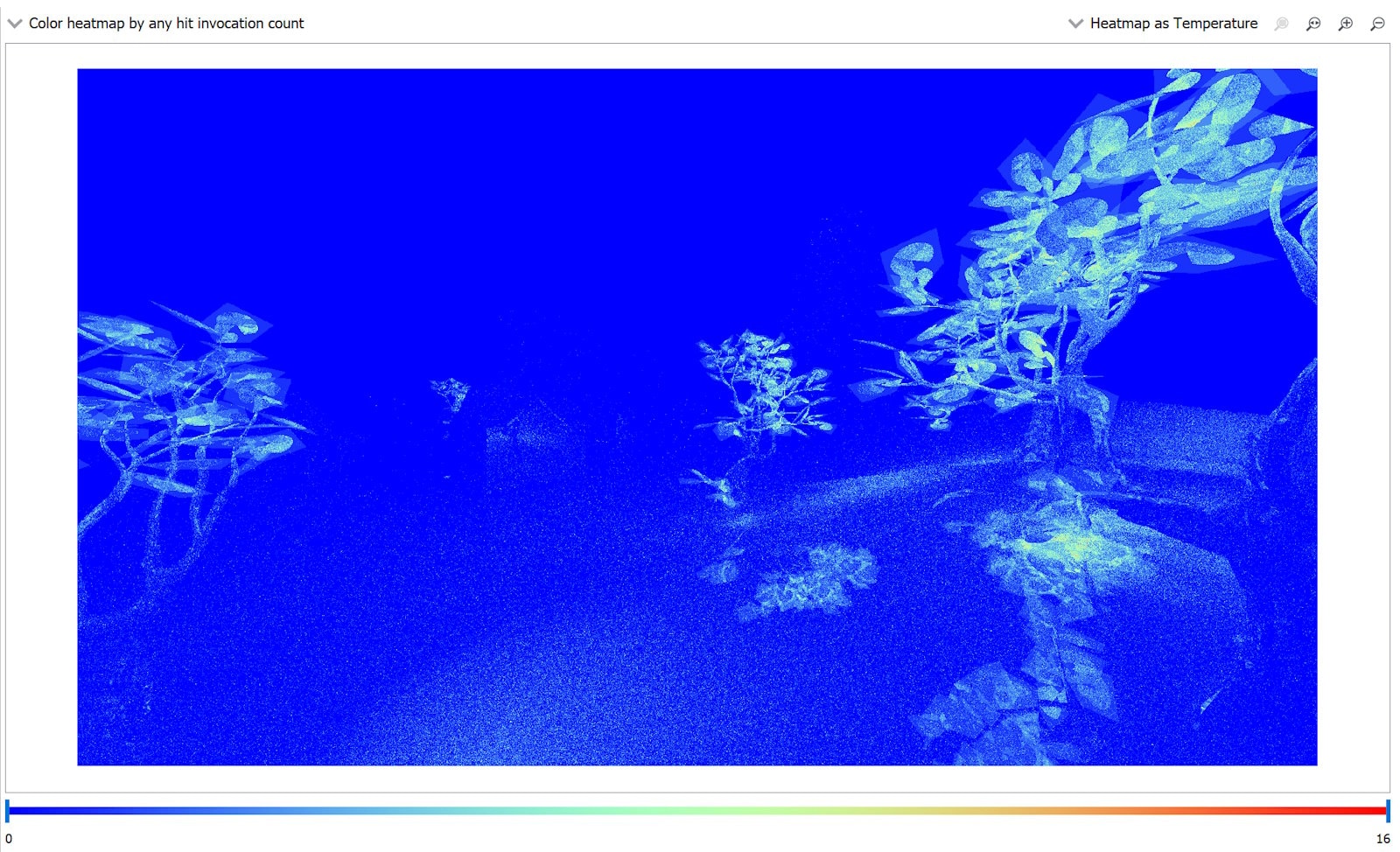 在示例应用程序中,树叶是唯一的非不透明几何体,因此每次任何命中调用都是由光线与其中一个叶子三角形相交引起的。主要光线调用任何命中着色器很重要,因为它对最终图像(叶子的睡莲形状)有易于识别的效果,但反射光线和阴影光线可以跳过调用任何命中着色器,而不会显着降低图像质量。通过对除主要光线之外的所有光线传递 RAY_FLAG_FORCE_OPAQUE 标志,任何命中调用的次数会显着减少,如热图所示,总调用次数从 1,360,096 减少到 323,359。