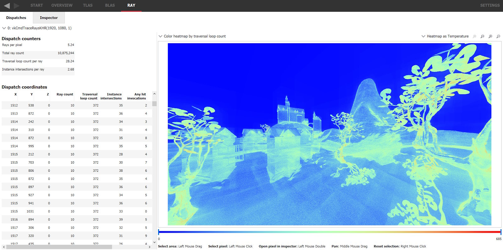 打开包含光线数据的跟踪的光线 (Ray) 面板时,会有一个热图图像,可视化该分发的遍历统计信息。它显示的具体统计数据由其上方的下拉菜单设置。左侧显示了每个分发坐标的列表,数字对应于热图。请注意,热图中的每个像素通常与渲染图像中的像素紧密对应,除非使用了 Upscaling(上采样)或非 1:1 映射(如 1D 分发)。如果使用了 1D 分发,只要存在非稀疏映射,它们就可以重新映射到任何给定维度。