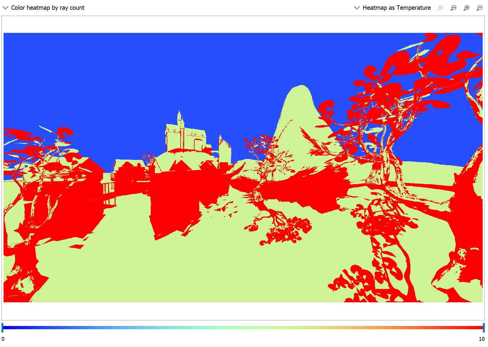 该热图看起来让人联想到 TLAS 和 BLAS 面板中的遍历渲染模式,不同之处在于,此视图不像遍历渲染模式那样是模拟的,并且不允许通过移动或旋转相机来改变视角;它是捕获应用程序中投射的光线的实际记录数据。