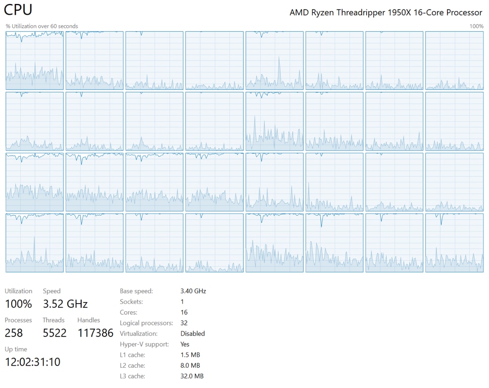 Ryzen Threadripper 1950X 为 Xbox One 目标编译 Claybook 的所有着色器。几乎 100% 全核利用。3.52 GHz 时钟速率,比基础时钟高 120 MHz 睿频。深蓝色表示在内核中花费的时间,浅蓝色表示在用户代码中花费的时间。