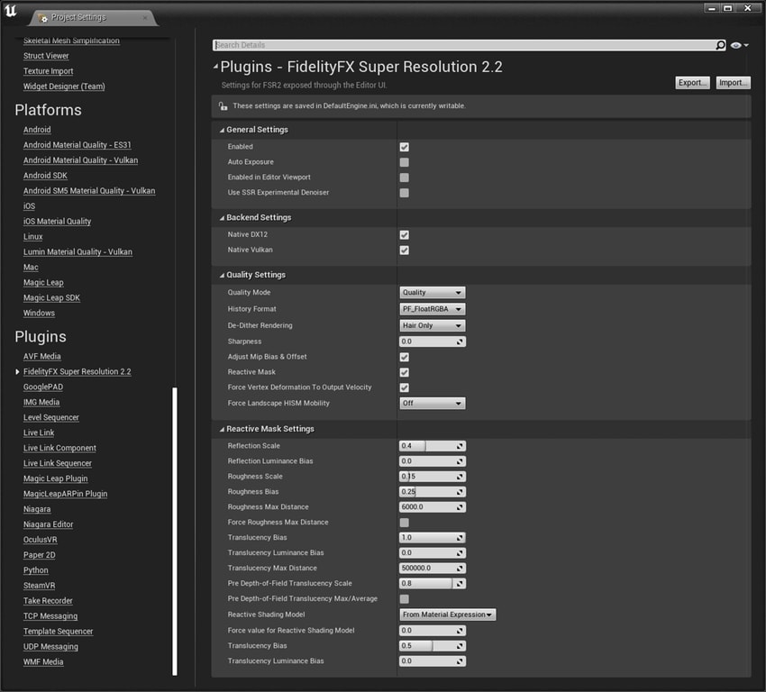 | r.FidelityFX.FSR2.UseNativeDX12 | 1 | 0, 1 | 设置为 True 以使用 FSR2 的本机和优化的 D3D12 后端,设置为 False 以使用基于 Unreal 的 RHI 的回退实现。 |