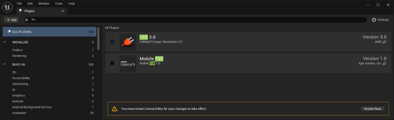 当提示时,单击 Restart Now 应用更改并重启 Unreal Engine。