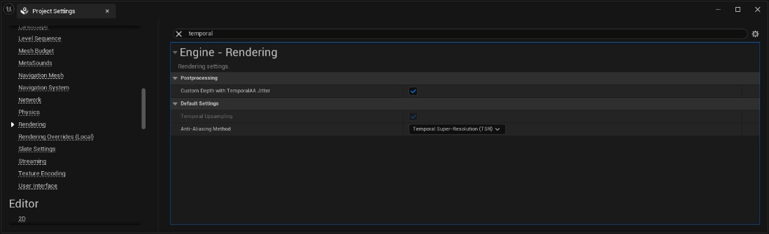 在Project Settings > Rendering窗口中,必须启用Temporal Upsampling,并且Anti-Aliasing Method应设置为 Temporal Super-Resolution (TSR),可以通过Edit > Project Settings 在 Unreal Engine 工具栏中访问,或者通过控制台变量启用 r.TemporalAA.Upsampling 并将 r.AntiAliasingMethod 设置为 4。
