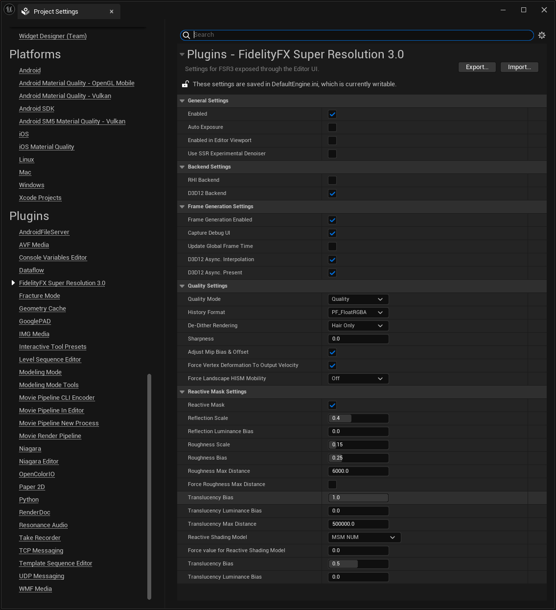 可以通过Project Settings > FidelityFX Super Resolution 3.1设置面板更改“Frame Generation Enabled”的设置来启用或禁用帧生成。它不影响编辑器,并且需要启用 FSR3 时域放大器,因为它需要放大组件生成的输入。