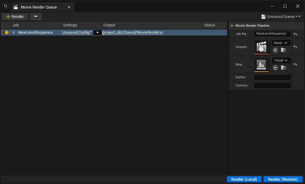 点击“未保存的配置”以打开 Movie Render Queue 的设置。