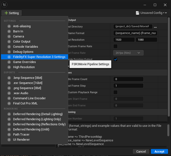 启用 FSR3 MovieRenderPipeline 插件后,可以使用 FSR3 加速渲染序列器(Sequencer)的过场动画,通过虚幻的 Movie Render Queue。