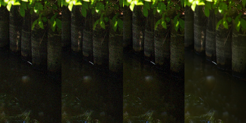 TPDF 通过降低接近 -1 或 1 的噪点值出现的概率,从而减少了可见噪点的量。这有一个积极的视觉副作用,即提高了细节的清晰度。然而,这也似乎带来了一个能量不守恒的副作用:量化值更有可能保持在一个区域内。在上图的深色区域,颜色向黑色靠拢(在一个没有任何纯黑值的区域)。