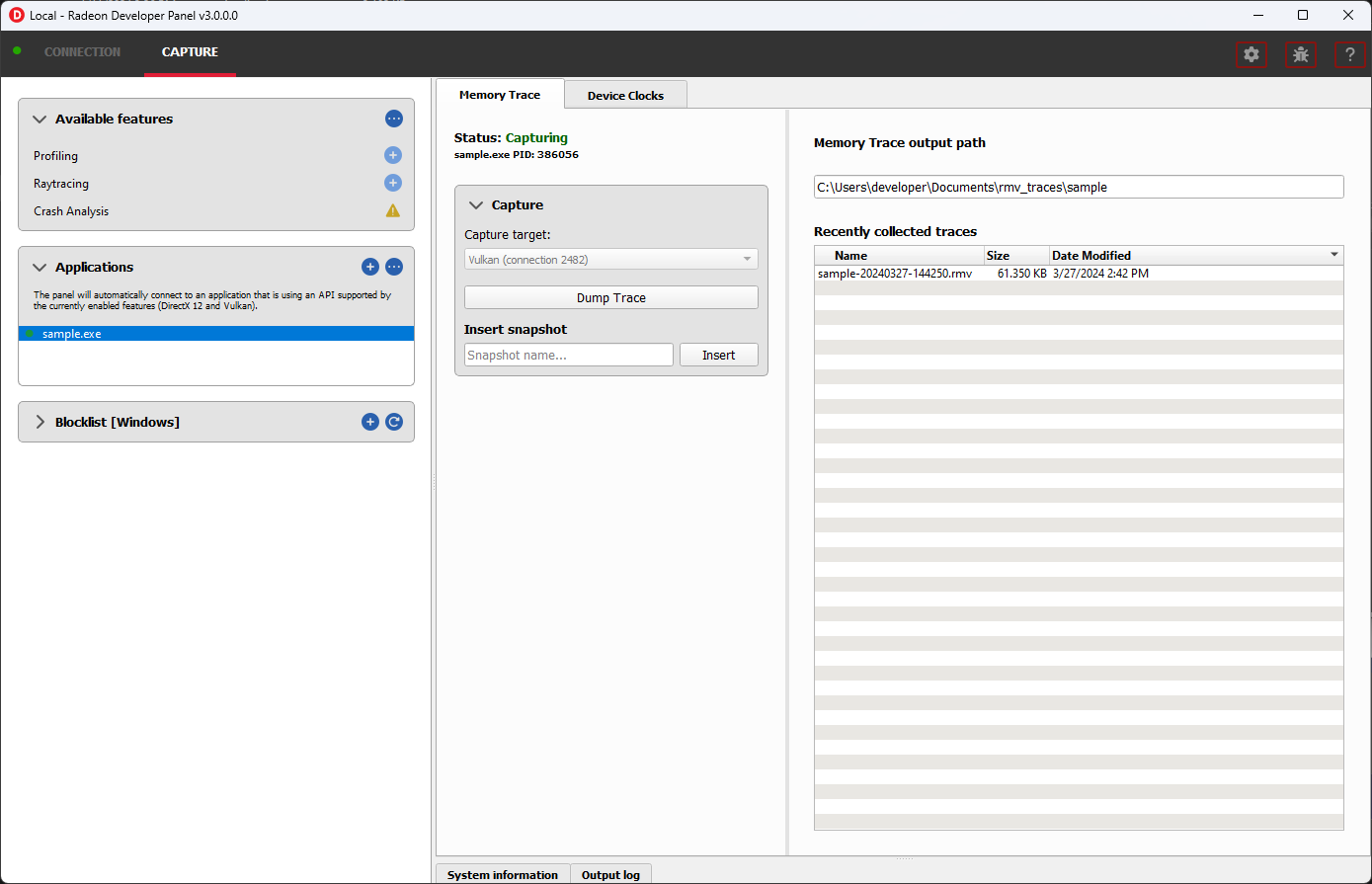 通过上述任一方法完成内存跟踪将导致 Radeon Memory Visualizer 跟踪文件被写入磁盘。