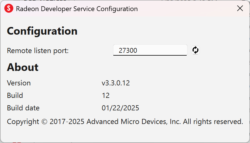 监听端口 - Radeon Developer Service 用于监听远程 Radeon Developer Panel 入站连接的端口。**默认端口为 27300**。更改端口将断开所有现有会话。可以单击“监听端口”字段右侧的圆形箭头图标,将端口重置为默认值。