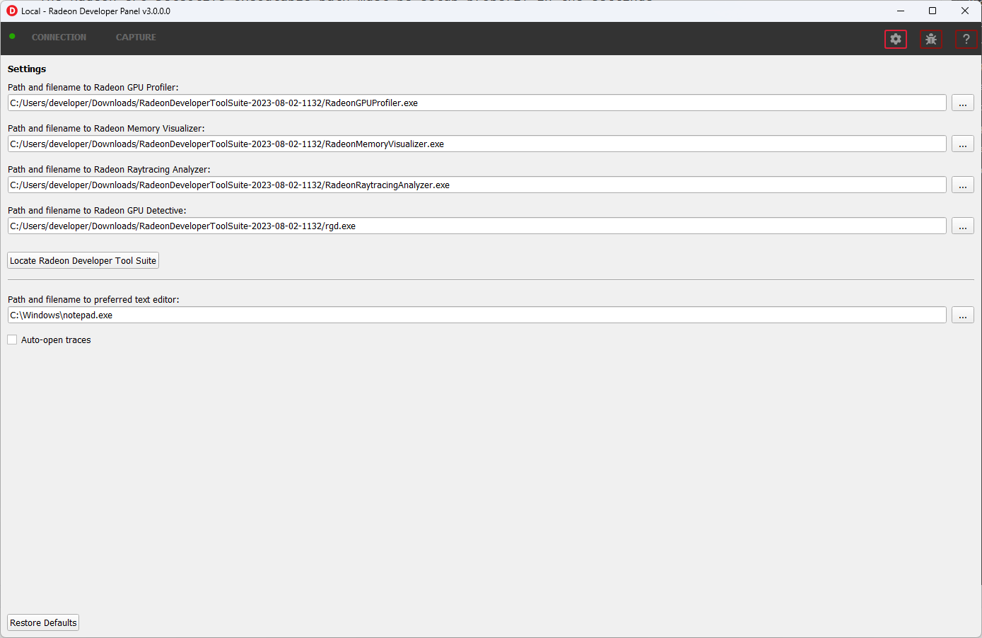 设置窗格允许您选择 Radeon Developer Panel 用于打开捕获的配置文件、跟踪和场景的工具的全局路径。为了方便起见,使用 定位 Radeon Developer Tool Suite 按钮将允许您选择下载的 Radeon Developer Tool Suite 包并自动配置所有路径。
