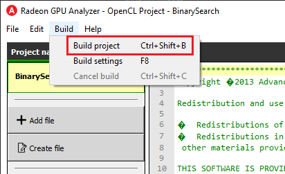 RGA 项目是一个可以包含任意数量的 OpenCL™ 源文件(.cl)以及一组构建设置的容器。当您构建项目时,OpenCL™ 源文件将被编译并链接成单个代码对象二进制文件。