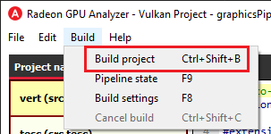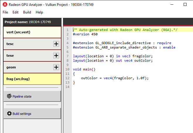 创建/添加文件后,您可以在编辑器中编辑源代码。这不仅适用于 GLSL 文本代码。也可以在 RGA 中加载 SPIR-V 二进制文件。如果您这样做,该二进制文件将被反汇编,您将能够以文本代码的形式进行编辑。编译后,RGA 会为您重新汇编 SPIR-V 二进制文件。